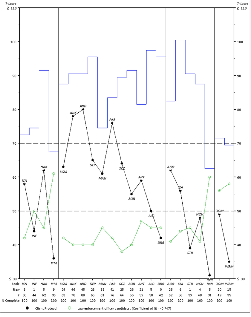 Below is the profile of an active RCMP member with 10 years of service. The black line represents the member’s scores on various mental health symptoms/disorders. In his case, the circled-black peaks represent an anxiety disorder and post-traumatic stress disorder (PTSD). Lower, in green, is a comparison to the scores of police officers at the start of their careers. The difference between current functioning and pre-policing is a concerning reality – nonetheless this graph represents the functioning of the average police officer and highlights the daily personal challenges many police officers endure.